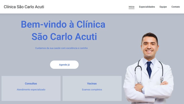 Site com design limpo, responsivo, rápido e fácil de usar em qualquer dispositivo. Cada detalhe foi pensado para apresentar a clínica de forma profissional e confiável, do agendamento online à apresentação de serviços.